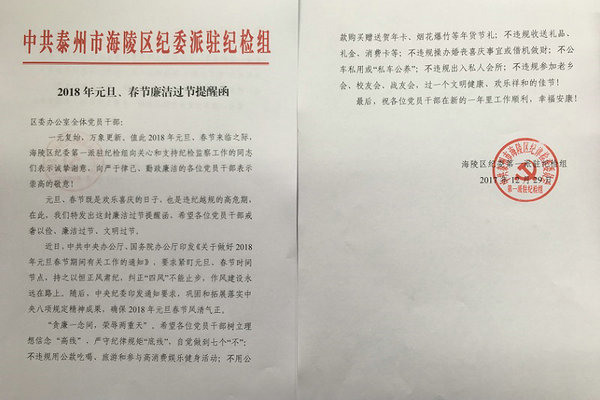 元旦、春节将至,为坚决遏制“四风”问题反弹回潮,区纪委第一派驻纪检组特向被监督单位发出廉洁过节提醒函,巩固和拓展落实中央八项规定精神成果,督促被监督单位党员干部戒奢以俭、廉洁过节。。 要求党员干部树立理想信念“高线”,严守纪律规矩“底线”,自觉做到七个“不”:不违规用公款吃喝、旅游和参与高消费娱乐健身活动;不用公款购买赠送贺年卡、烟花爆竹等年货节礼;不违规收送礼品、礼金、消费卡等;不违规操办婚丧喜庆事宜或借机敛财;不公车私用或“私车公养”;不违规出入私人会所;不违规参加老乡会、校友会、战友会,过一个文明健康、欢乐祥和的佳节! |